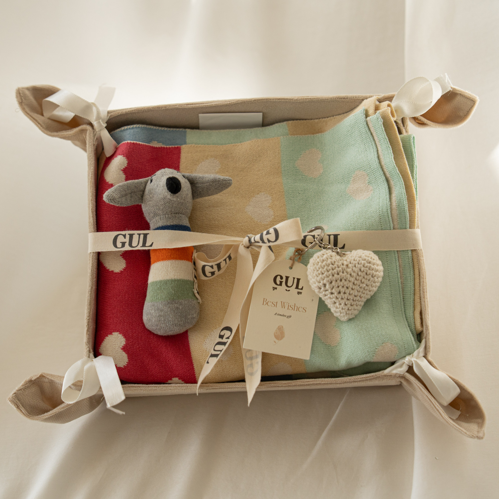 Presented in a velvet tray, this set includes a soft baby blanket, a playful doggy rattler toy, and a white heart keychain symbolizing purity and love. Carefully arranged, it blends practicality with artistry, making it a perfect gift for newborns and young children.