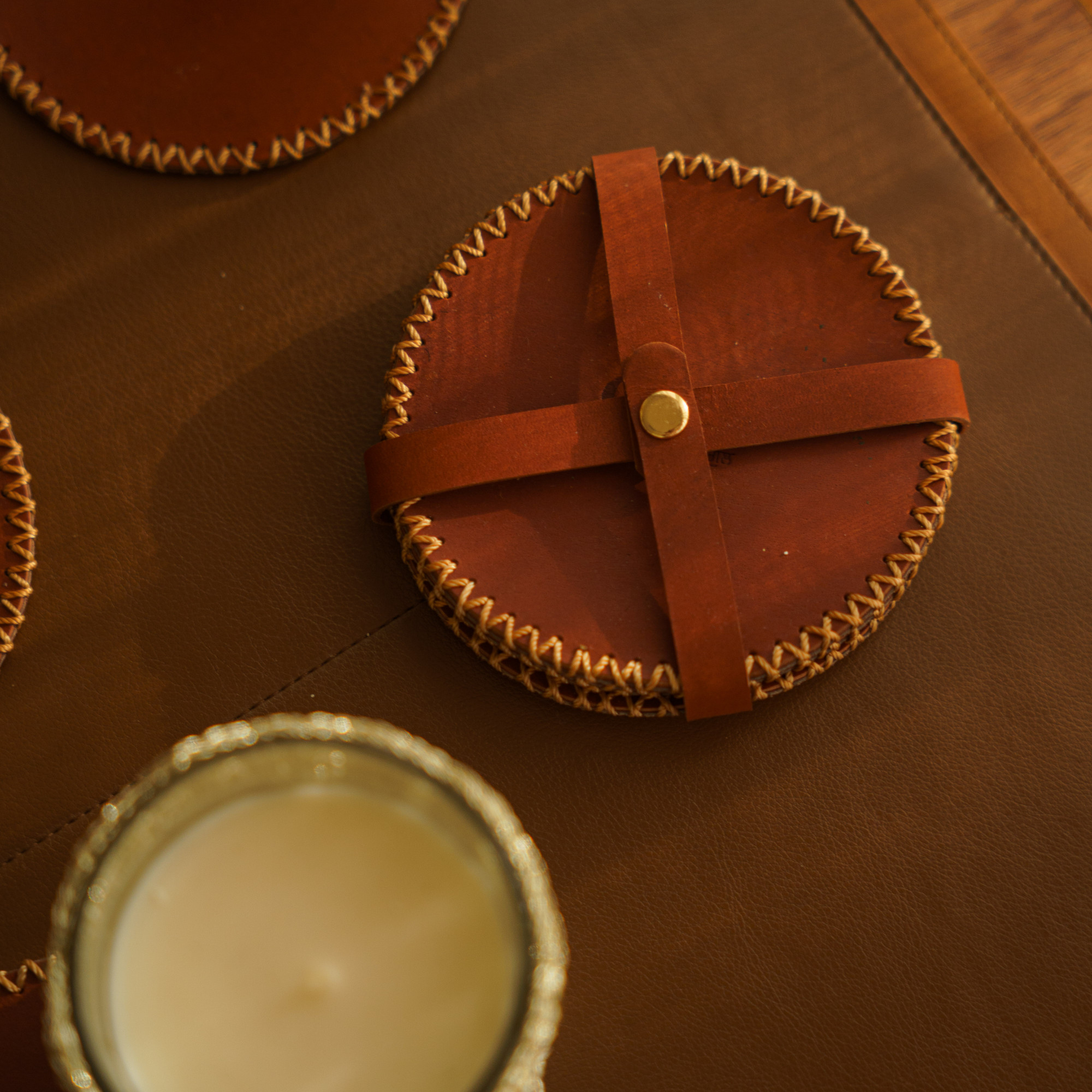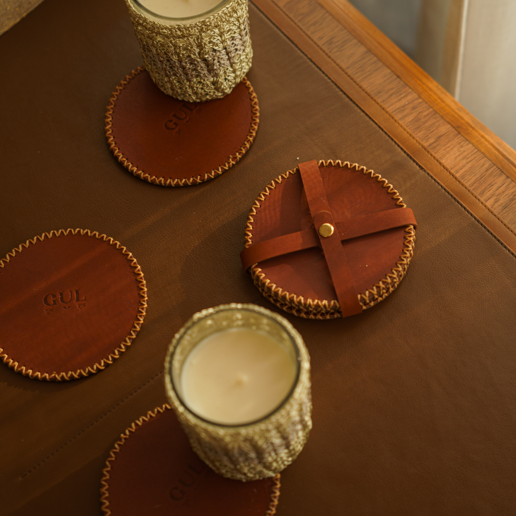 Candeur Elegance with Poise Coasters – A Touch of Grace in Every Detail. This refined set pairs warmth and sophistication in perfect harmony. It includes a rose fragrance soy wax candle, encased in a hand-crocheted metallic candle cover, alongside four luxe vegan leather coasters. Thoughtfully designed for both utility and beauty, this set is an elegant addition to your festive table or a meaningful gift for loved ones. Each crochet piece is handcrafted by skilled women artisans, making this collection a celebration of creativity, care, and craftsmanship.