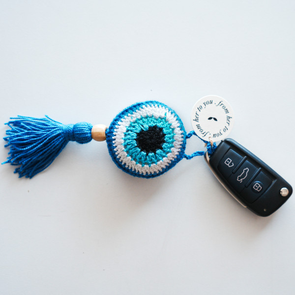 Protective, playful, and purposefully handcrafted — the Evil Eye Key Charm with Tassel is more than just an accessory. Symbolizing protection and good luck, the intricately made evil eye charm wards off negativity, while the soft tassel adds a touch of texture and bohemian flair. Whether clipped to your keys, bag, or pouch, this Key Charm is a stylish reminder of positivity and mindful living. A meaningful gift or a personal talisman for everyday good vibes.