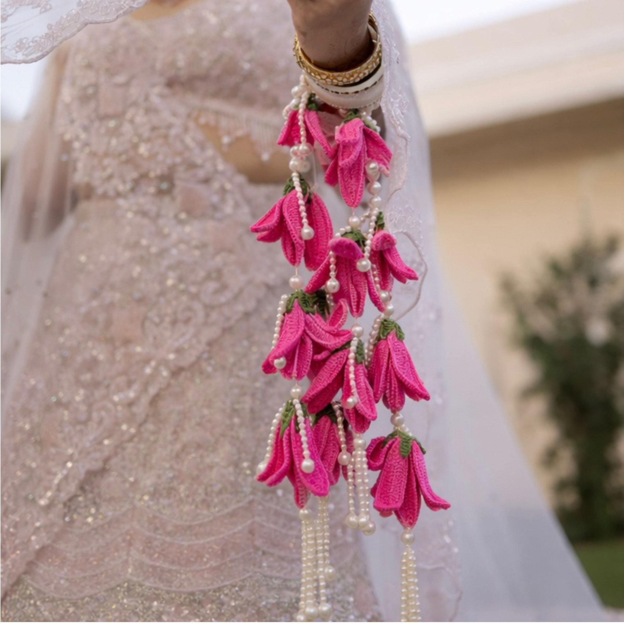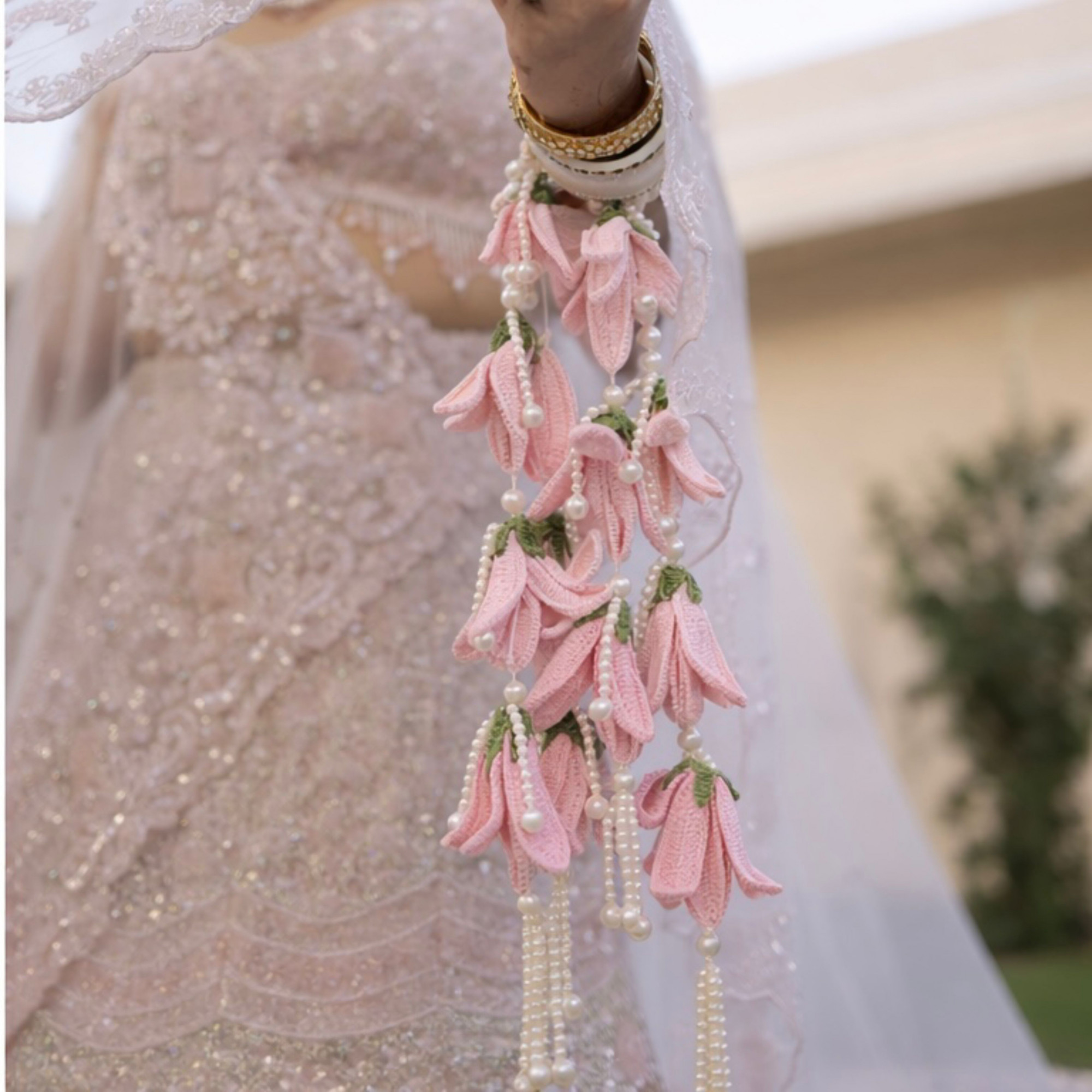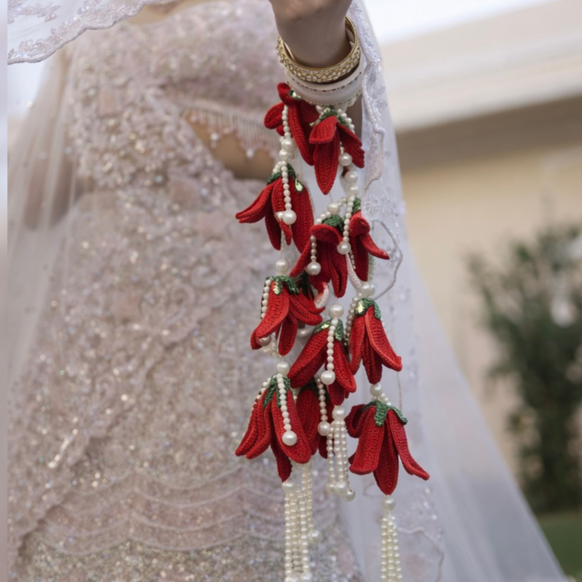 Our exquisite Pearl & Lily Kaleera exudes delicate charm and elegance, featuring beautifully crafted crochet tulips adorned with soft white pearls. Designed with intricate detailing, it symbolizes love, joy, and new beginnings, making it a meaningful accessory for wedding celebrations. Gracefully suspended and lightweight, it adds a soft, romantic touch that complements bridal and bridesmaid attire beautifully. Perfect for haldi, mehendi, or wedding ceremonies, this kaleera brings a graceful blend of tradition and modern elegance to your special day. They are available in distinct colours like Red, White, Light Pink, Fuchsia Pink, and Ombre.
