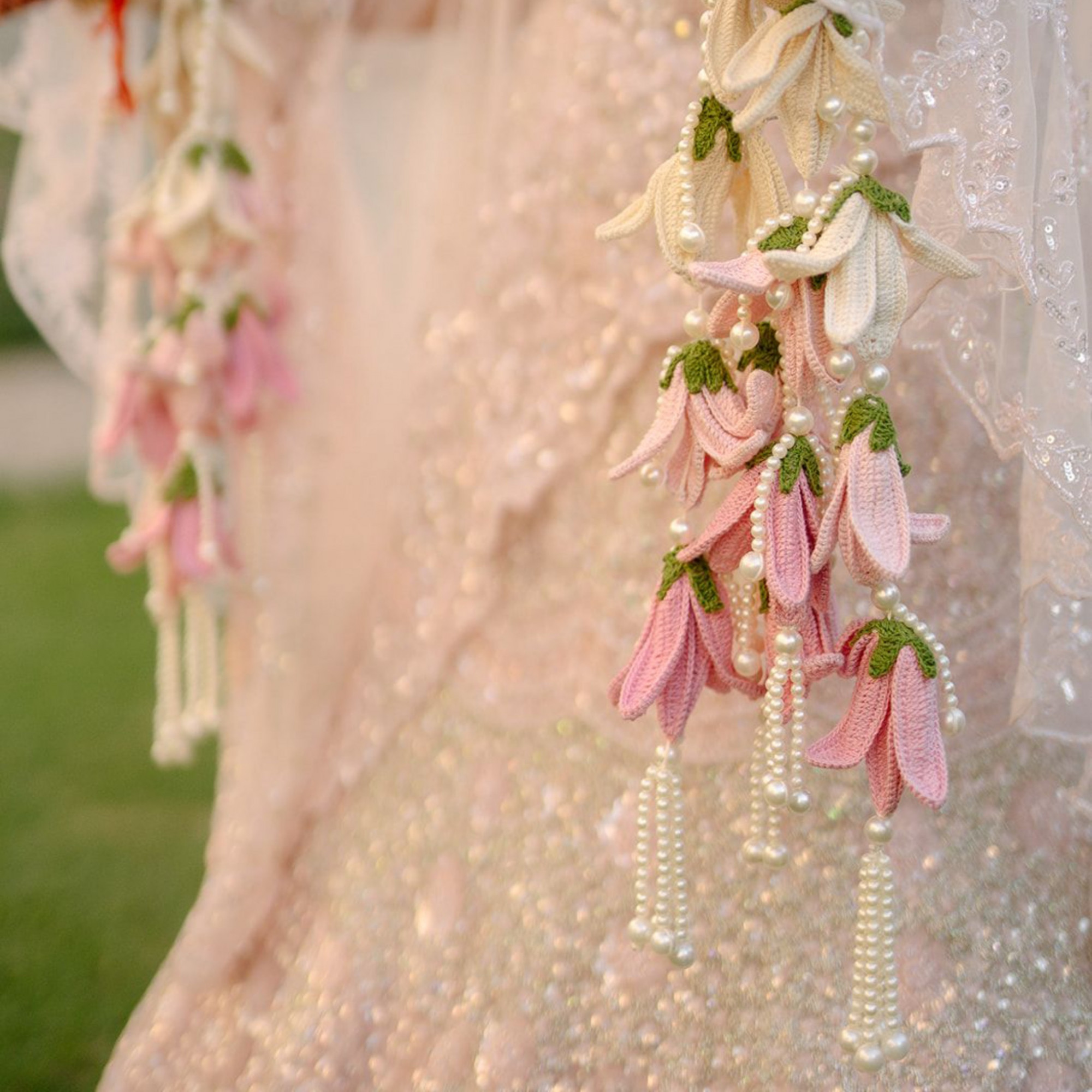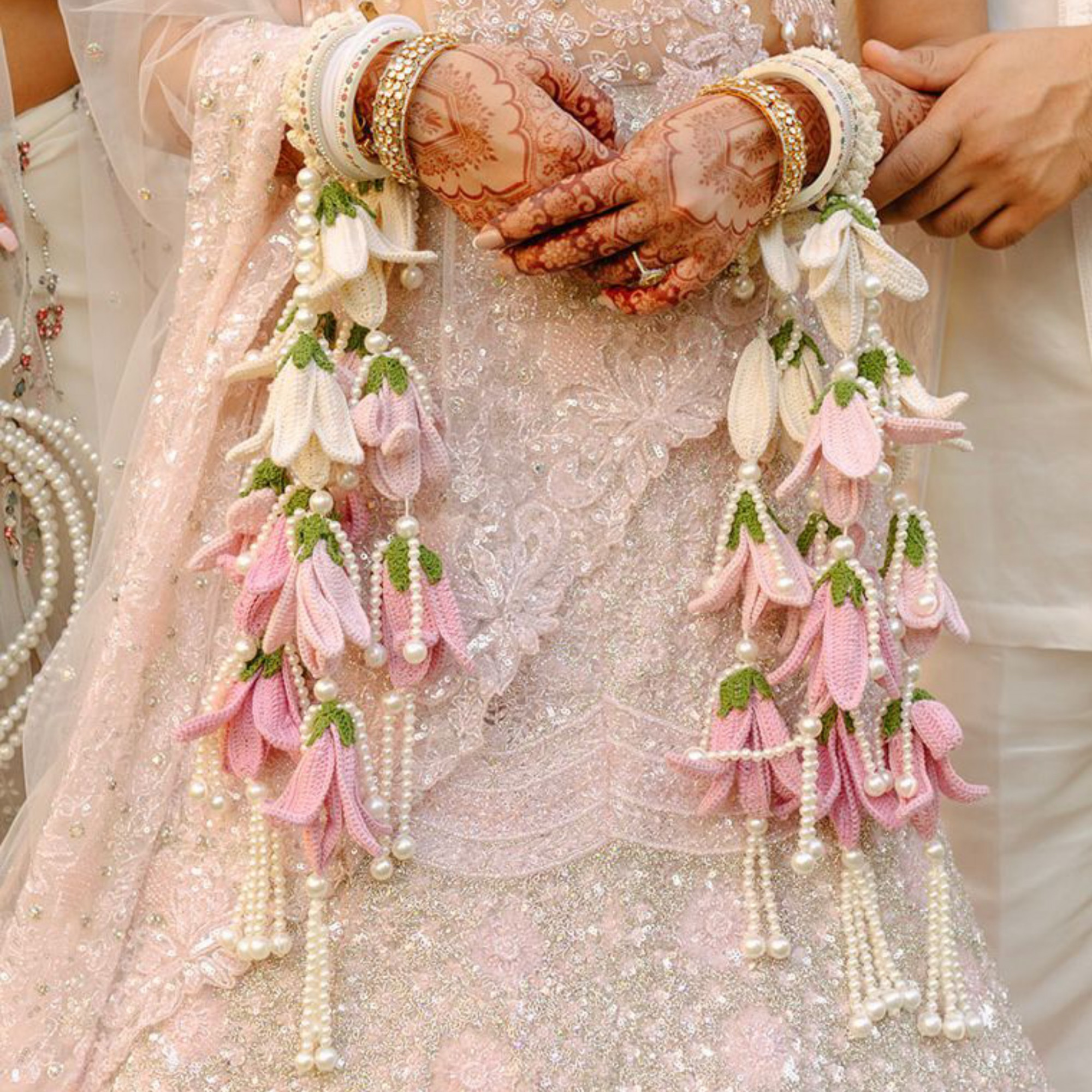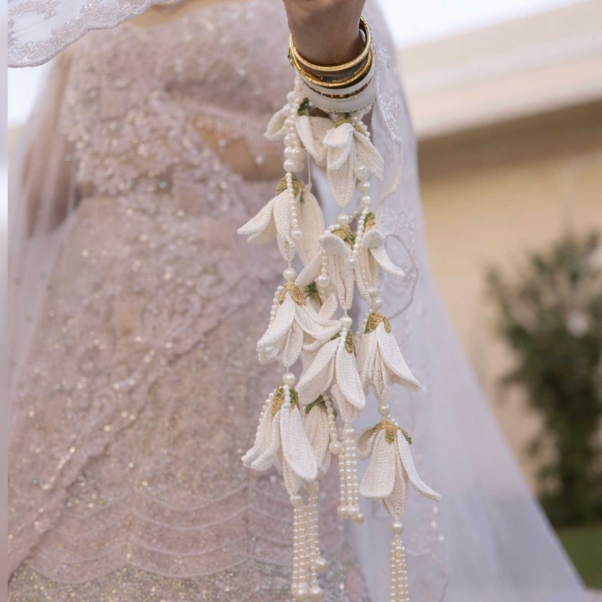 Our exquisite Pearl & Lily Kaleera exudes delicate charm and elegance, featuring beautifully crafted crochet tulips adorned with soft white pearls. Designed with intricate detailing, it symbolizes love, joy, and new beginnings, making it a meaningful accessory for wedding celebrations. Gracefully suspended and lightweight, it adds a soft, romantic touch that complements bridal and bridesmaid attire beautifully. Perfect for haldi, mehendi, or wedding ceremonies, this kaleera brings a graceful blend of tradition and modern elegance to your special day. They are available in distinct colours like Red, White, Light Pink, Fuchsia Pink, and Ombre.