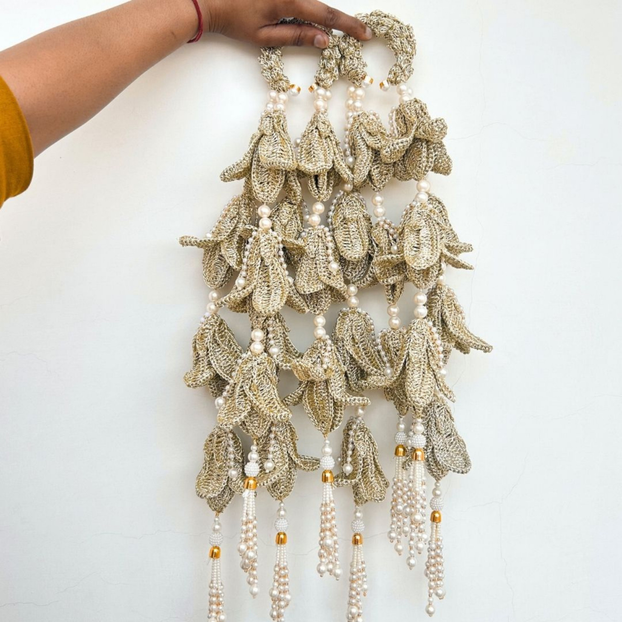 - 100% Cotton Yarn – Pair of Kaleeras, each featuring 4 cascading layers with 12 tulips flowers.