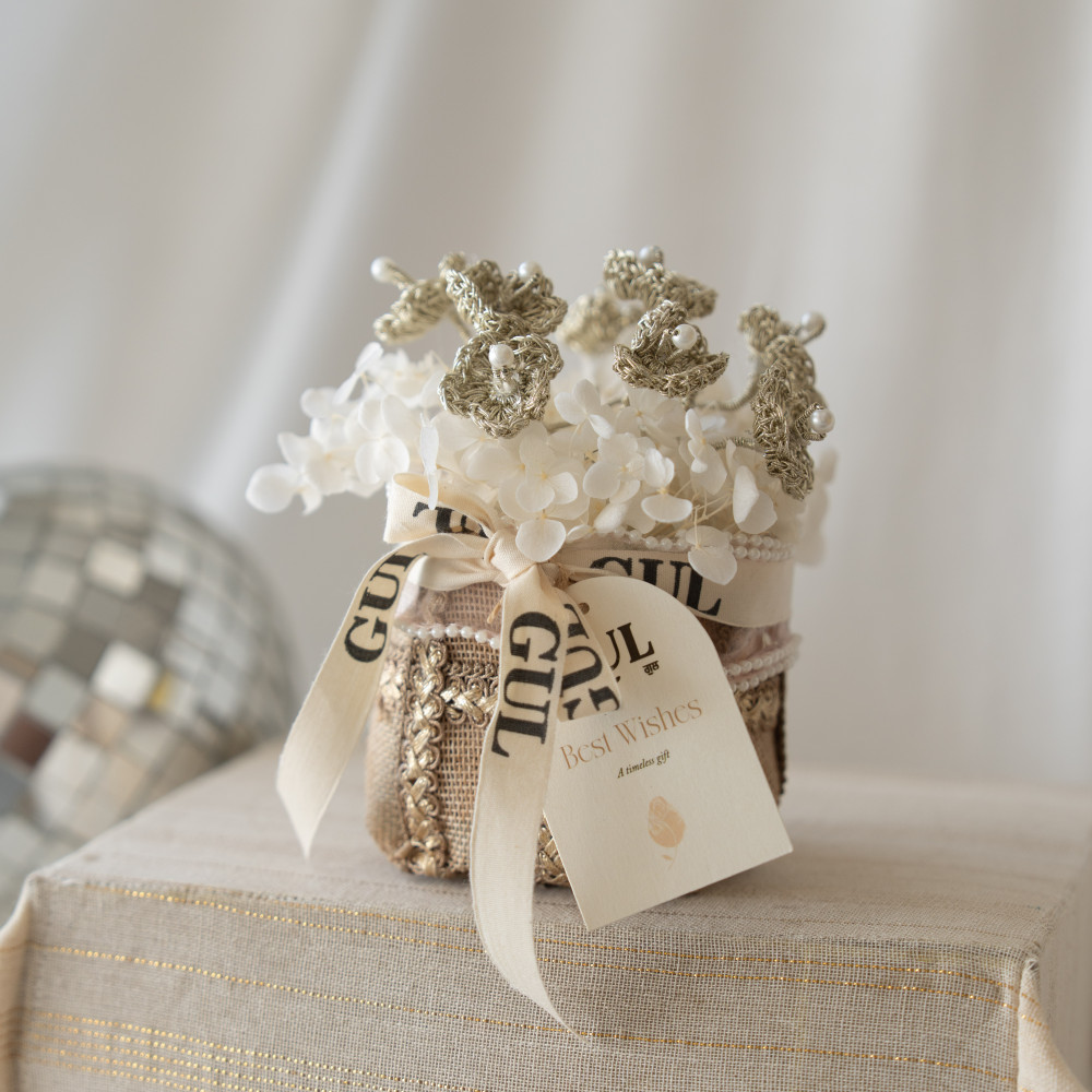 Featuring a single metallic crochet mini bloom accented with pearl detailing, this piece is set in a jute‑wrapped base adorned with golden embellishments and a refined ribbon. Its rustic yet luxurious appeal makes it a timeless gift that conveys warmth and sophistication.