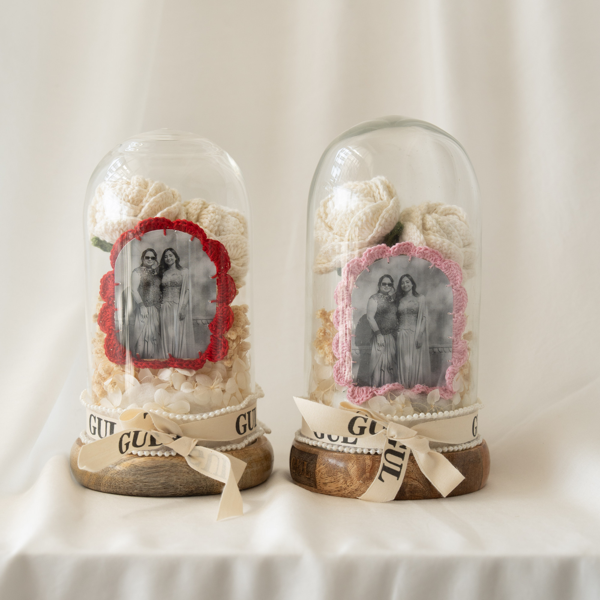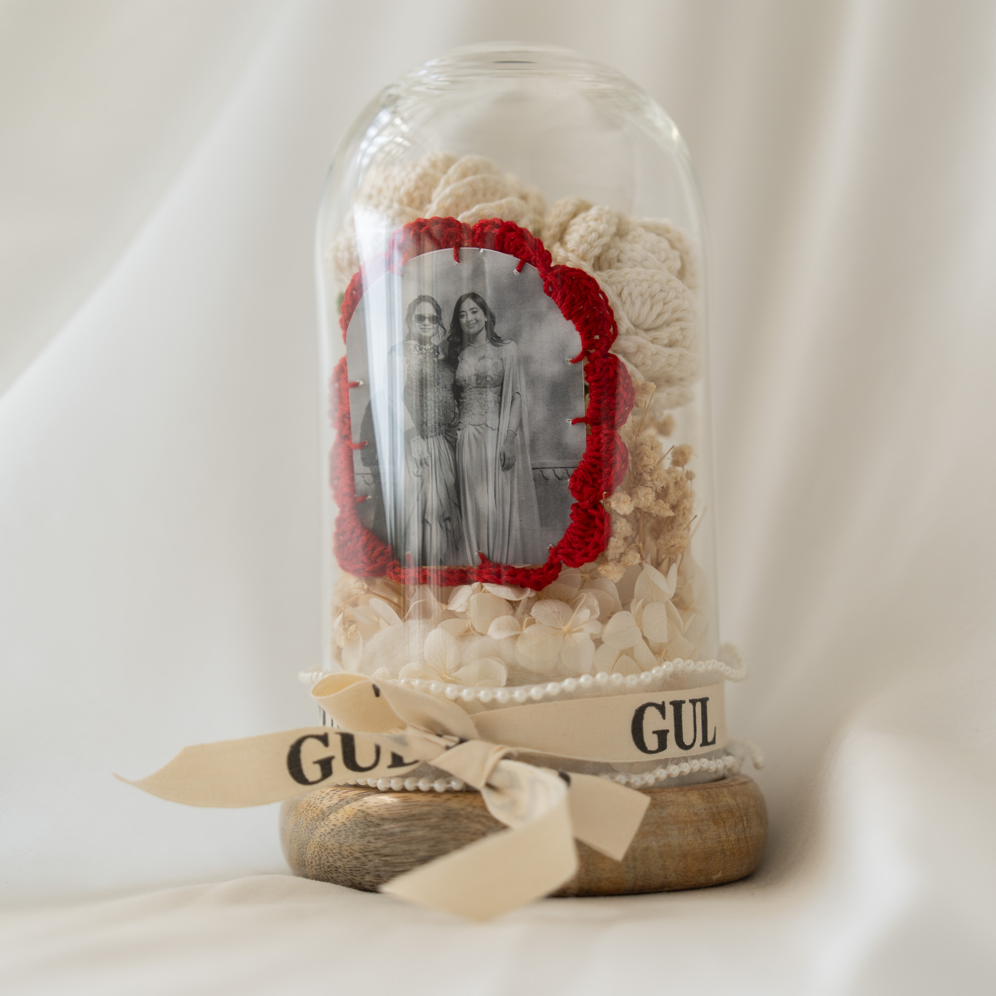 Encased within a delicate glass dome, two crochet white roses bloom alongside a personalized photograph framed with red lace detailing. The wooden base and ribbon accents add refinement, making this piece a perfect blend of artistry and sentiment.