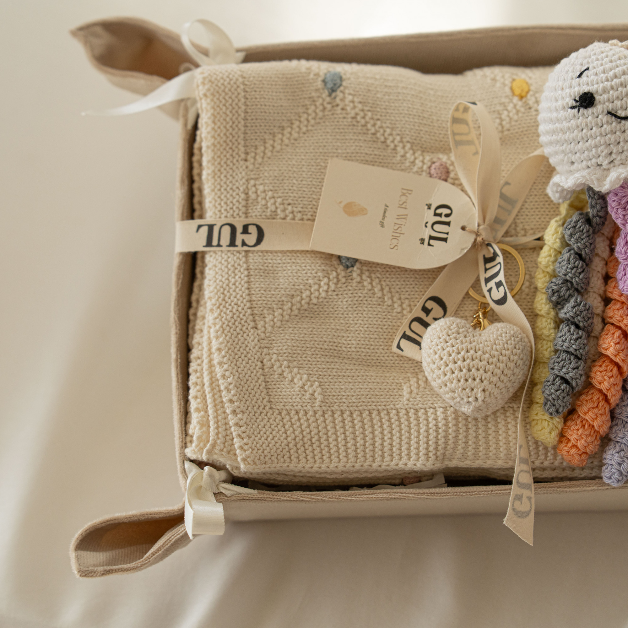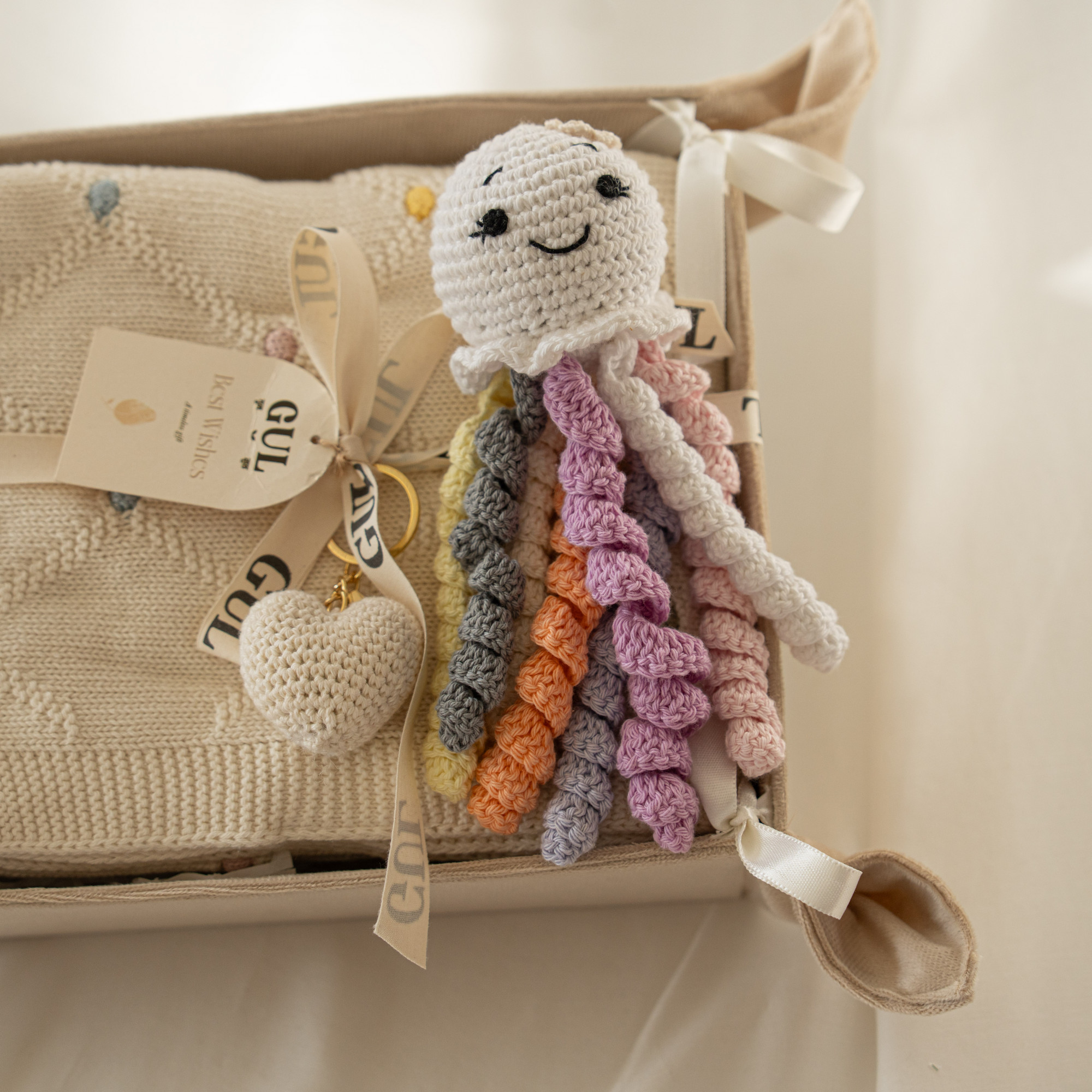 Presented in a velvet tray, this set features a soft gray panda‑patterned knitted baby blanket, a crochet jellyfish toy with colorful tentacles, and a white heart keychain symbolizing purity and affection. Thoughtfully arranged, it blends practicality with artistry, making it a perfect gift for newborns and young children.