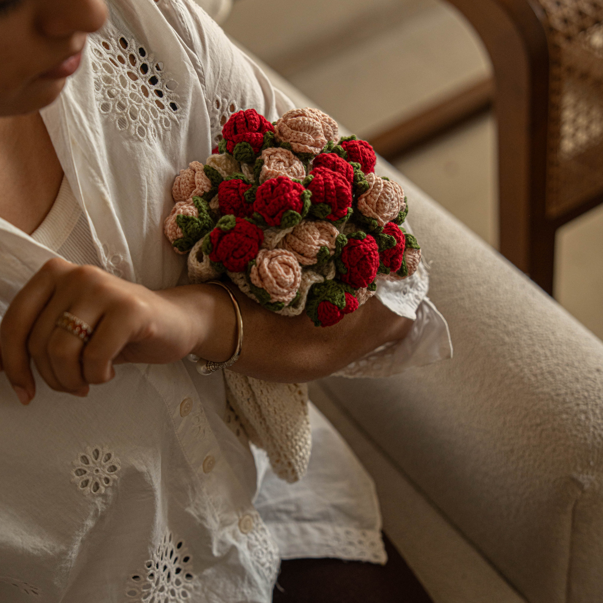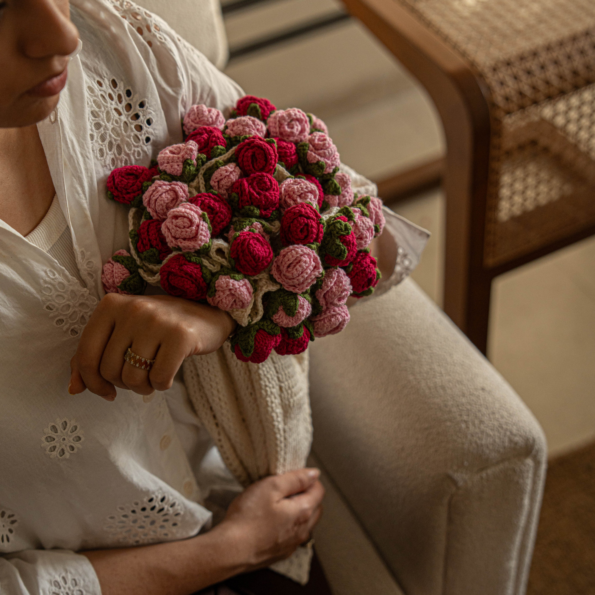 Each blanket is bordered with colorful crochet roses, creating a radiant garden‑like frame. Available in two variants, the larger bouquet features 44 multicolor roses, while the smaller version carries 24 roses — both equally charming and timeless.